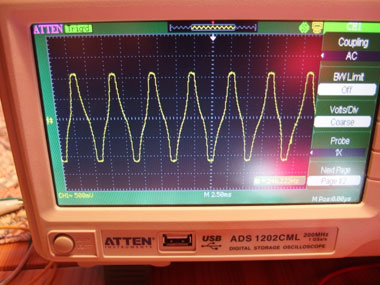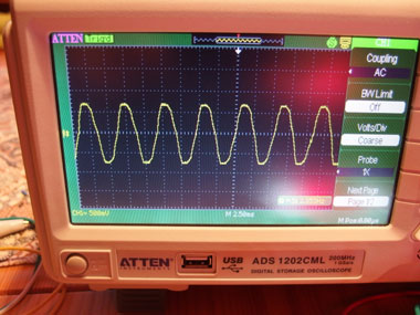 Den vänstra oscilloskopbilden visar utspänningen från 5W spolen utan överspänningsskyddet aktiverat. Den högra bilden med skyddet aktiverat. Nu liknar det lite mer en sinusvåg. .