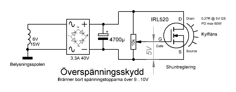 Elektroniskt överspänningsskyddJag har gått en annan väg. Vill reglera vid vilken spänning överspänningsskyddet startar. Om växelströmmen först likriktas, så blir det lättare att styra shuntningen av generatorspolen elektroniskt. En MOS-transistor fungerar här som ett variabelt effektmotstånd. Transistorn börjar inte att leda förrän spänningen på gaten G närmar sig ca 5V. Denna transistor är en "logikvariant". Standard MOS-transistorer vill ha ca 10V på gaten för att öppna. Med trimpotentiometern ställes önskad spänning in där transistorn börjar att öppna och belasta generatorspolen. Det blir inget knivskarpt läge där transistorn öppnar. Vid min bänktest så började transistorn öppna vid ca 6,5V och helt öppen vid 9V. Genom att bulta transistorn vid en kylplåt, så ledes överskottsvärmen bort. Denna transistor kan hantera 60W. . Uppföljning