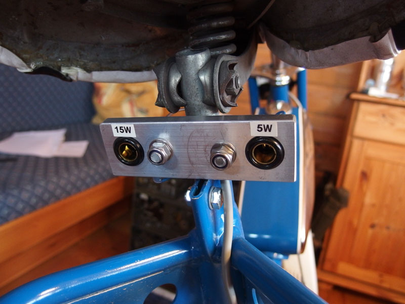 Två uttag på sadelstolpen. 15W är ämnat för batteriladdning till mina amatörradioapparater. 5W uttaget är avsett för belysningen på släpkärran.