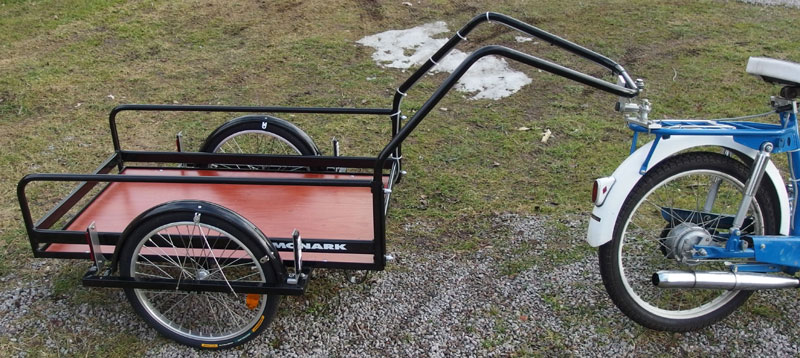 Detta är fruns älsklingskärra i trädgården. Den tänker jag renovera upp och låna för att koppla efter mopeden. MOPED KLASS 1 (45km/h) Moped med registreringsskylt. Förordning (2000:1166).18 § Till tvåhjulig moped klass I får inte kopplas släpvagn med en bredd som överstiger 125 centimeter eller med en vikt som överstiger hälften av mopedens tjänstevikt minskad med vikten av bränsle och verktyg som hör till fordonet.Till tre- och fyrhjulig moped får inte kopplas släpvagn med en bredd som överstiger mopedens bredd eller i något fall 200 centimeter, eller med en vikt som överstiger hälften av mopedens tjänstevikt minskad med vikten av bränsle och verktyg som hör till fordonet. Förordning (1998:1263).