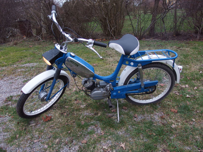 Då har jag blivit med moppe igen, 50 år sedan sist!! En Crescent 1209 från 70-talet med en Sachsmotor 50/2 KS. En så kallad budgetmoped, utan bromslyse eller hastighetsmätare. Den klassen fick väga högst 60 kg och ha max 2 växlar. Idag tillhör denna moped Klass II. 25/30km/h maxfart. Nya mopeder får bara göra 25 km/h, de gamla får behålla sina 30 km/h. Mopeden är i fint skick och jag tackar den föregående ägaren för det. Då i december 1963, hade jag en Zündapp KS50. Oj vad jag frös... men köras skulle det! Och helst barhuvad, det var inte tal om hjälmar eller mössa då. Tuff skulle man va'! Den som är född innan 1 oktober 2009 behöver inget förarintyg eller körkort för moped klass II. Transportstyrelsens otäcka dokument som användes vid flygande besiktningar. Här låg polismannen på knä och räknade antalet kuggar runt kedjehjulen! Numera kontrollerar de bara OM mopeden går för fort, inte varför... och pekar isåfall mot besiktningshallen med en ny dyrbar registreringsbesiktning som följd! Plus några feta inbetalningsavier. Idag oljar man inte ner sina fingrar med att plocka bort cylindrar, kolvar eller förgasare och mäta upp håldimensioner. På min tid körde de in tolkar i cylinderloppen för att kolla att inte någon fil hade varit framme och öppnat upp för flödet av bränsle till cylindern. Den där omtalade "pluggen" satt olika hårt på vissa mopedmodeller!