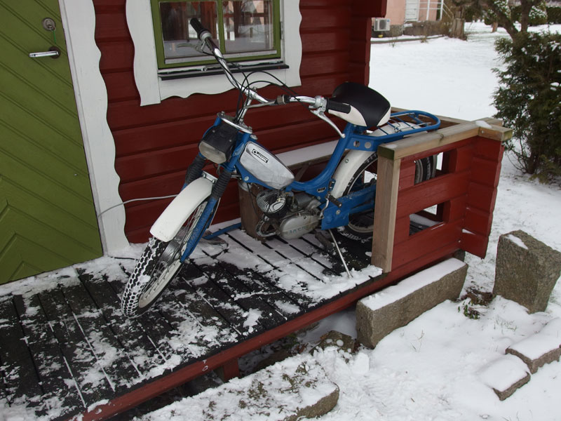 Mopeden inhandlades under trettonhelgen i januari 2014. Men redan under de snörika vintermånaderna måste sommarens körningar planeras. Som radioamatör funderar man på hur det skall gå att ladda batteri, telefon och GPS, medan man kör?? Jag har ingen bra uppvärmd verkstad, så friggeboden får tjänsgöra som teknikbod. Därinne brinner braskaminen och ger skön värme under det att mopedens elsystem testas. Motorn får puttra på drygt tomgång därute. Med sladden från mopeden klämd i dörren.