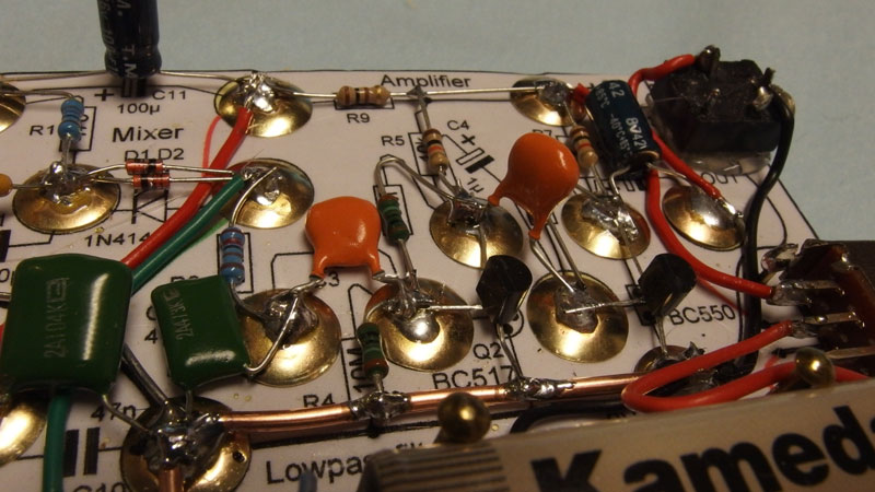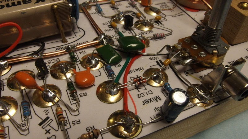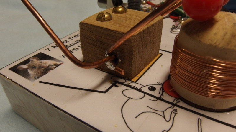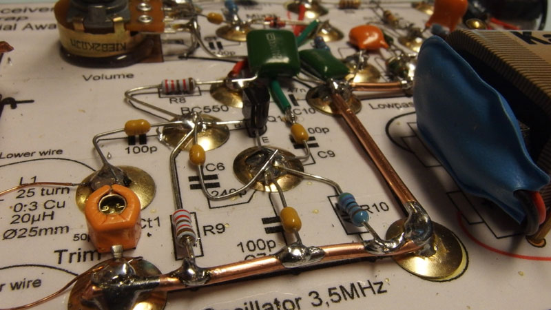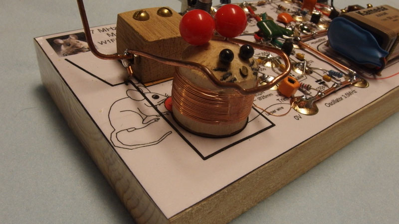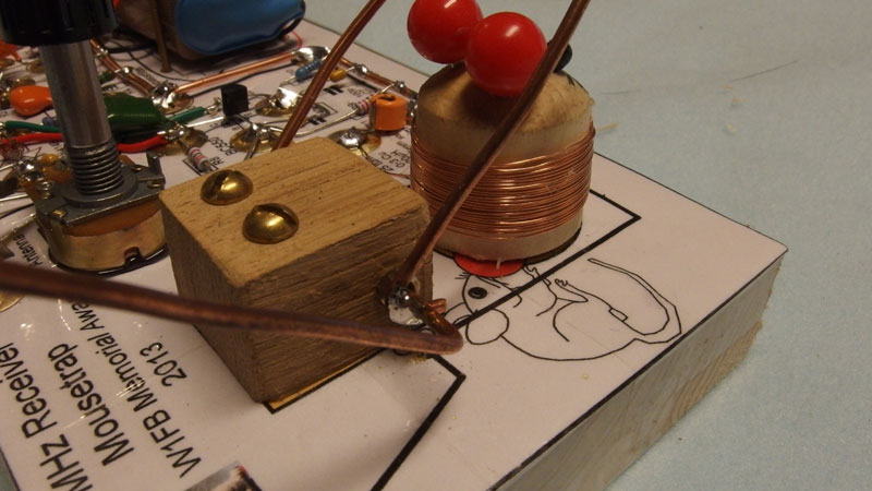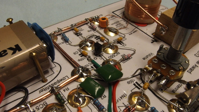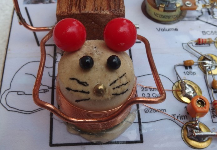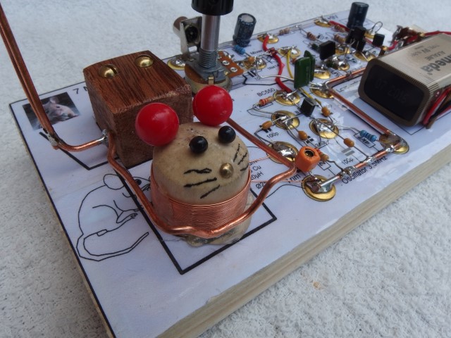 A simple receiver with three transistors and only one coil wound on a broomstick ! The tuning is done with a copper wire shaped like a mousetrap.