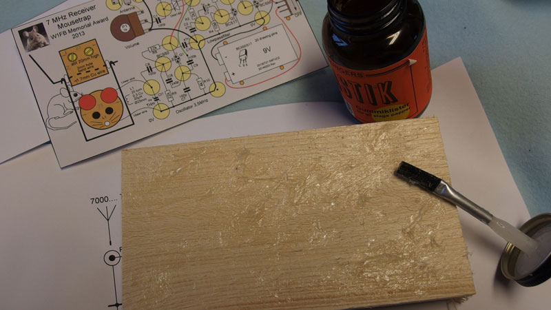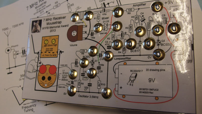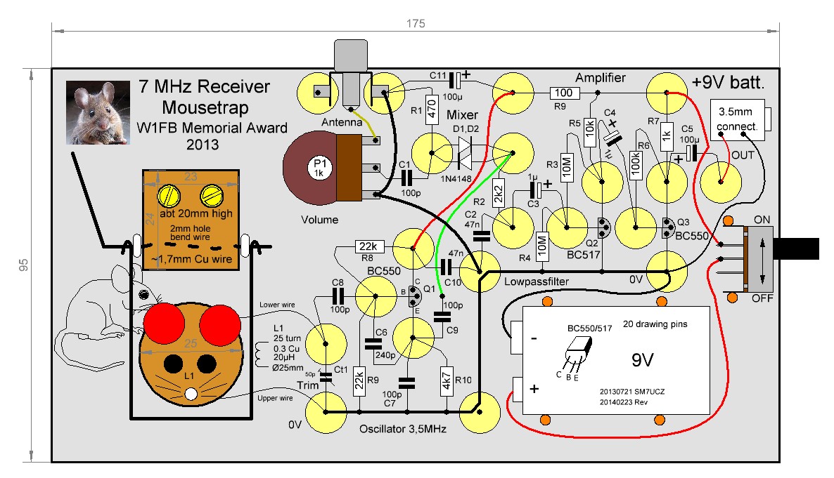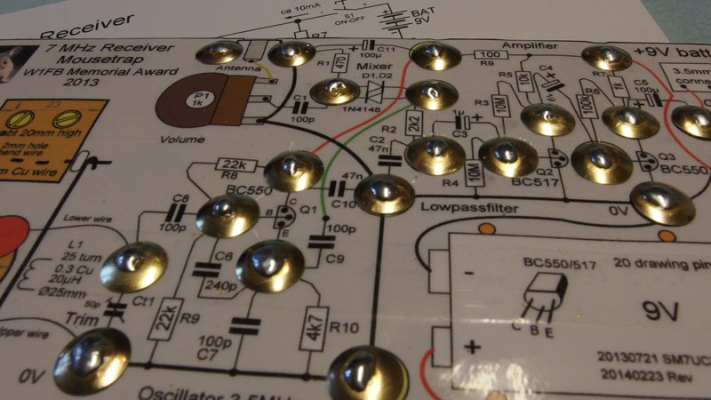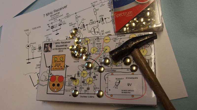 The receiver is built up on a wooden plate with dimensions of 175 × 95 × 22. A sawn-off piece of a standard board that is machined on three sides. This layout is pasted on the board and blank thumbtack placed in the respective dots. Download the drawing here. And use this link to a program " viewer " to print out the drawing in scale 1:1