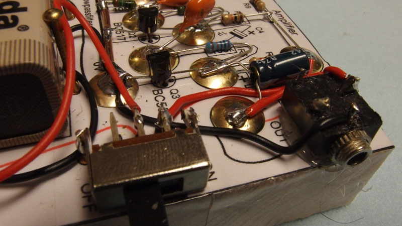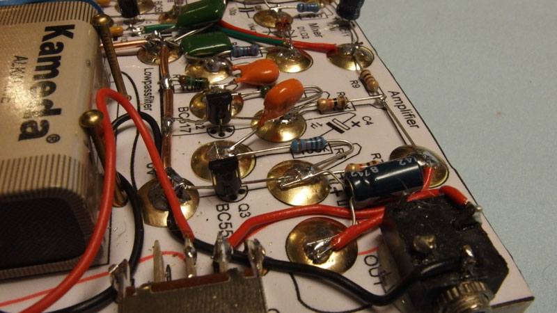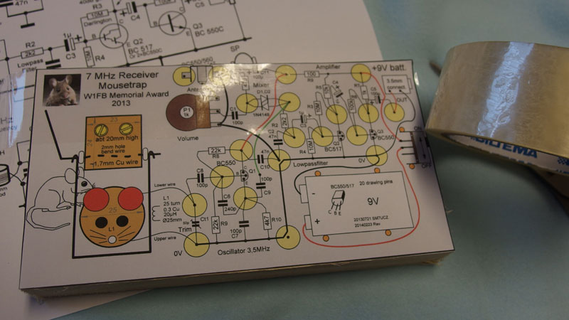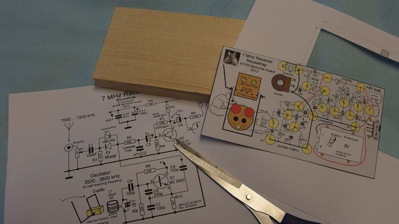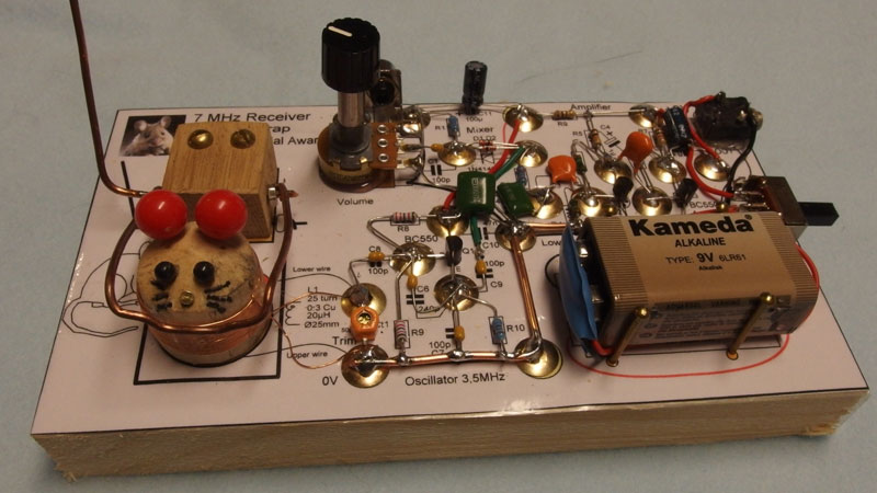 The goal was to build a simple receiver , it goes without expensive components. The oscillator operates at half the reception frequency and doubled in mixer. With trimcapacitor , Ct1 , trimmed frequency to 3500kHz when the mousetrap is standing straight up . The frequency will then increase when the trap folds down over the coil. Receiver sensitivity depends on the gain after the mixer. A Darlington transistor Q2 basically consists of two interconnected transistors and represent the greatest gain. I built my Darlington from two BC550 . Q3 gives power boost to the headphones. Normal computer headphones.