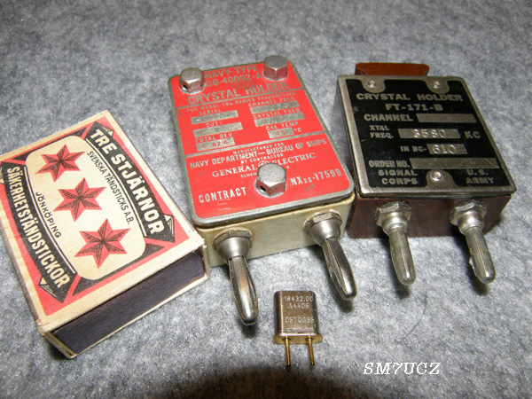CrystalsThe crystals for the Paraset is of the big size. They fit direct in a power outlet!! I used the cabinets and placed smaller crystals inside. The first crystal controlled transmitter was in a university in USA in 1924 on 3 Mc and about 5W. Not long time thereafter hams started to make their own crystals. The army didn't use any crystals. They used the freerunning VFO. Under the WWII it was impossible to get 4 different rigs (2 RX. + 2 TX) to spot the same frequency in same time. They needed crystals...USA started the big productions. At the end of the war, about 30.000.000 crystals were made per year. From Brazil, the only big mines in the world, the industries started up. USA buyed all quartz they could get. The crystals was grinded to right frequency from the beginning. This gave ageing problems, The frequency was rising after a while. The more expency methode, etching, was later used. In 1932 it was an article about crystals in the QST what changed the situation for many hams. In 1935 the new tube 6L6, and later the 807 came on the market. 6L6 was too strong for many applications so the 6V6 was developed. These tubes were the grounds for many amateurs after the war, and a big surplus of cheap crystals. Big crystals, easy to handle. A big porcelain housed crystal. Modified with a small modern crystal.