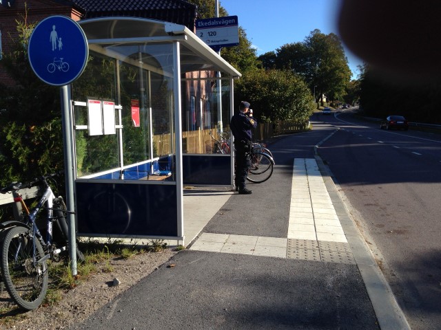 Trafikverket, väghållaren, har tuffa föreskrifter för de som jobbar med vägarna, att de skall använda godkända reflexkläder. I skymning, eller väder med nedsatt sikt, skall både väst och byxa i reflekterande material bäras. Men poliser, jobbar inte med vägen, utan på vägen. Alltså behöver de varken bära reflekterande kläder eller förstånd därtill. Och kan "gömma" sig i busskuren med laserpistolen. Men om det nu blir "napp"! Så måste den svartklädde rusa ut i trafiken för att stoppa syndaren. Kanske västen stramar för mycket och begränsar rörelsefriheten?