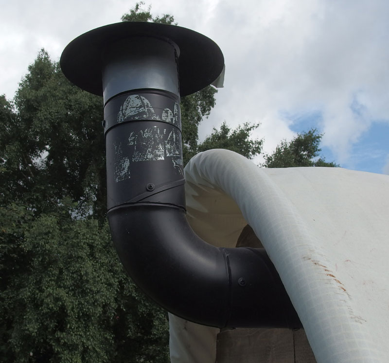 Under vintern fick jag tag på en mycket större brännare, som uppskattningsvis avger 400W. Nu inhandlades Ø100mm spirorör, två 90° böjar och en ventilhatt. Sprejade allt mattsvart. När det var +5C ute så fick jag upp temperaturen till +15C inne, på någon timma, med torr och ren luft. Första 1,5 metern av spiroröret blir så varmt att det går inte att hålla handflatan emot. Det strålar dessutom skönt från lampan och spiroröret. Temperaturen blir max ca +80°C på spiroröret, ingen brandfara. Ingen tendens till fotogenlukt inne. Brännarglaset packar jag ner i en vadderad väska under transport. Det går nästan åt all fotogen i behållaren under en natt, borde ha en större burk. Teoretiskt så förbrukas det 0,4dl fotogen i timmen, vid full låga.
