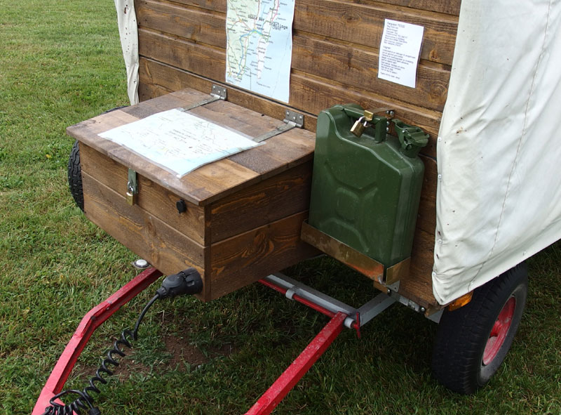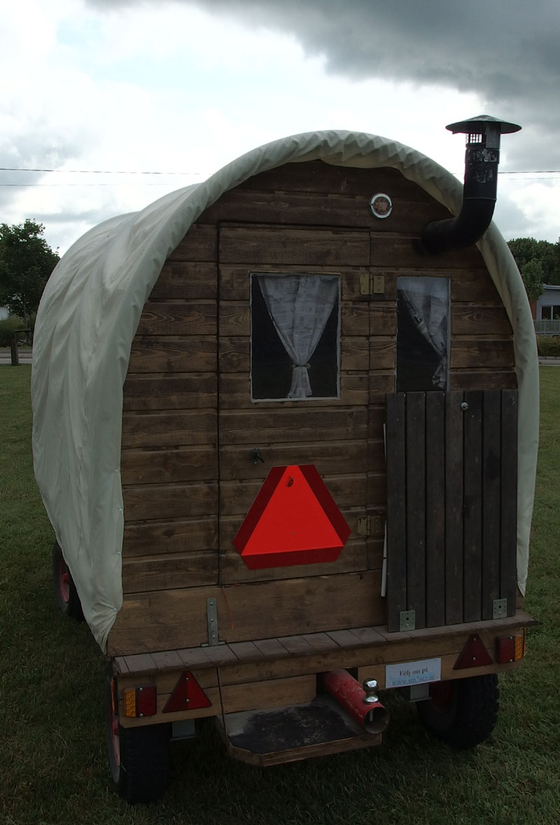 Det fick vara nog med nostalgi att snöra tältduken. Så nästa års resa var det tänkt att ha hårda gavlar, och en dörr. Några fönster för utsikten. Det är lite omständigt att snöra upp och igen kapellet. Desutom blir det inte vindtätt. Här hänger nu campingbordet på utsidan. Och ett fotsteg som underlättar klättrandet. Dragkroken är för nödbogsering ifall något ekipage havererar. Vi har en dragstång med oss på resorna. Full belysning och reflexer. Blinkers och bromsljus fungerar. Traktorn är elektriskt modifierad. Eftersom sikten bakåt är skymd.