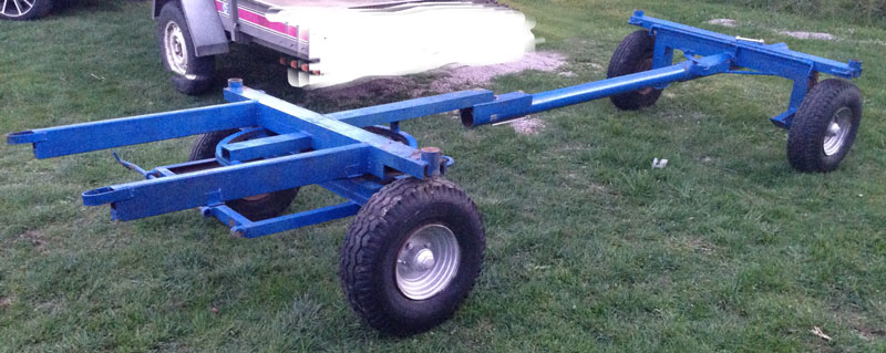 Skogsvagnen hittades på Blocket. Den var hjälpligt försäljningsmålad! Alla hjullager fick jag gå igenom med upptvättning och nytt fett. Några däck fick bytas. Annars var vagnen inte sönderdragen, som de brukar bli, när en traktor ersätter hästen i skogen. Då lastades gärna en stock extra. Den klarar nog några tons last, Det fanns bromsar på bakhjulen, men de hade rostat fast, och fick skäras bort. Vagnens bredd är 1400 mm och längden kan justeras genom att flytta bakre axeln efter det långa röret. De två främre "hornen" tog jag bort, det var något special påsvetsat av tidigare ägare.
