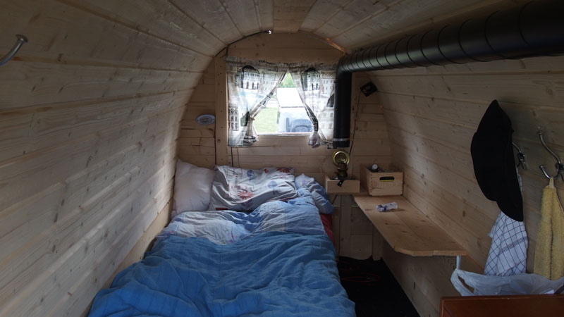 Sen ville jag ha lite hårda väggar vid sängen, så jag började att montera några 20mm spåntade panelbräder... och helt plöstligt slutade panelen ända upp i taket!! Plexiglas till rutorna. Detta gav en betydligt höjande komfortkänsla och värmeisolering. Jag har nog mer byggt en koja??