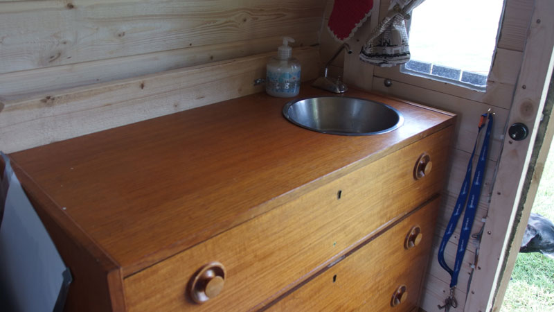 På en loppis hittades en perfekt fyrlådig hallbyrå med lås i varje låda. Transportsäkring. Ett annat loppisfynd var den rostfria bunken. En bordgenomföring i botten till avloppet, och en elektrisk pump från vattendunken under vagnen underlättar tandborstning och diskning. Fast monterad tvålpump för handtvätt. I lådorna finns köksutrustningen och maten som inte ligger i kylboxen.