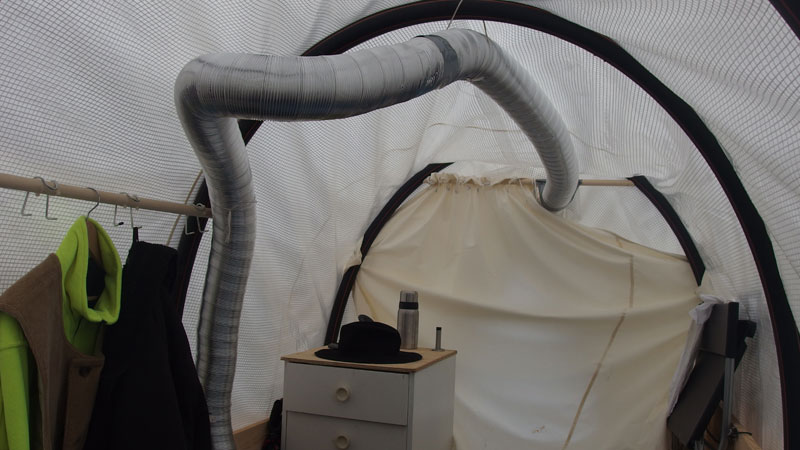 Här kan man se de fem 50mm plastslangarna som bågar. Duken är ett solsegel som man normalt spänner i trädgården, 5 x 5 meter. Tyvärr är duken inte riktigt vattentät, så det ligger en genomskinlig plastpresenning under.