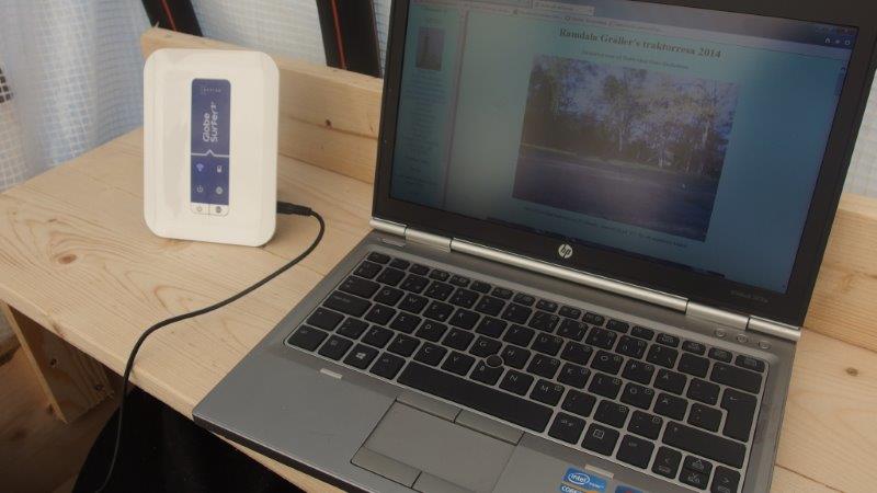 Sen... om det skall vara avkopplande så måste man vara uppkopplad! Här sköter en Globesurfer 3+ kontakten med yttervärlden. Den arbetar via WiFi till kameran på traktorn och datorn intill.