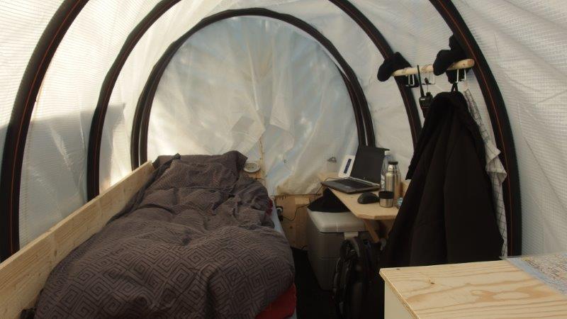 Sängen är uppbyggdca 400 mm, så därunder förvaras ett stort batteri, som kan försörja kylboxen, datorn, internet och belysning. Samt plats för extra kläder och annat. Det är betydligt bättre komfort än i ett två-manstält!