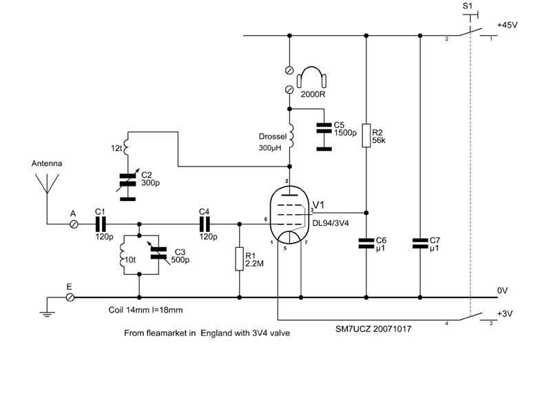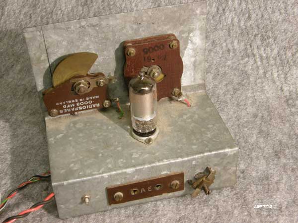 En återkopplad mottagare för vad?? Med ett rör DL94/3V4 och noggrant uppmärkta trådar. Uppkopplad mot antenn så var den ingen höjdare. Några starka "öststatssändare" gick in och återkopplingen var besvärlig att justera. Men för 14:-SEK fick jag lite komponenter.....