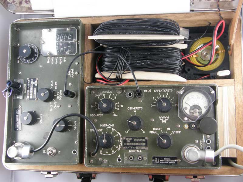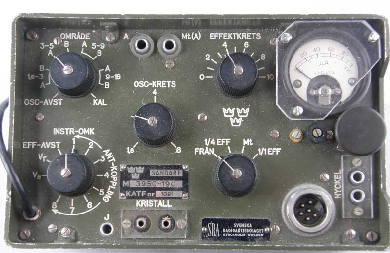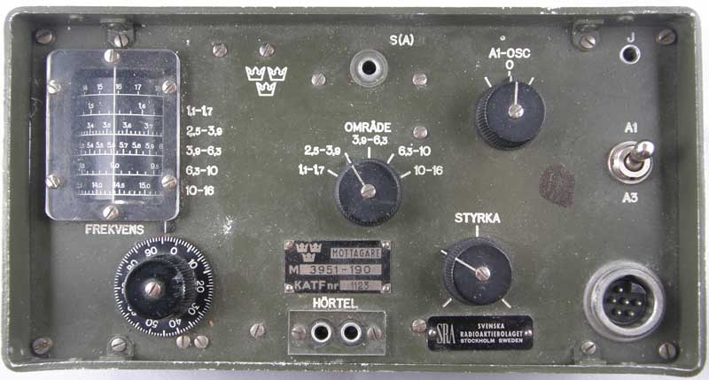 Denna svenska Ra190 radiomottagare/sändare hittade jag i England. Tyvärr fanns inte tillbehören med. Mottagaren täcker 1,1 - 16MHz både CW och AM. Sändaren är kristallstyrd med nästan samma täckningsområde. Uteffekten är blygsam, ca 0.8W.