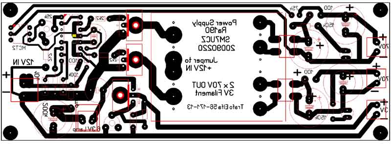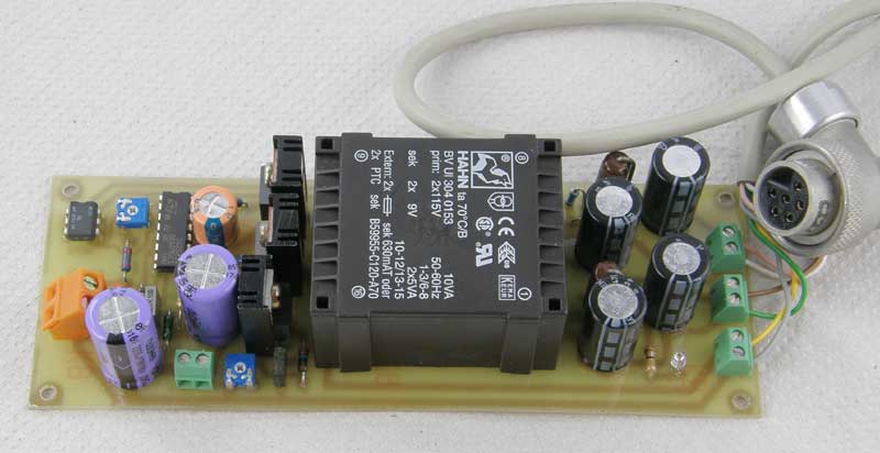 Kretskortet för strömförsörjningen. Likriktarbryggorna är monterade på undersidan av kortet.