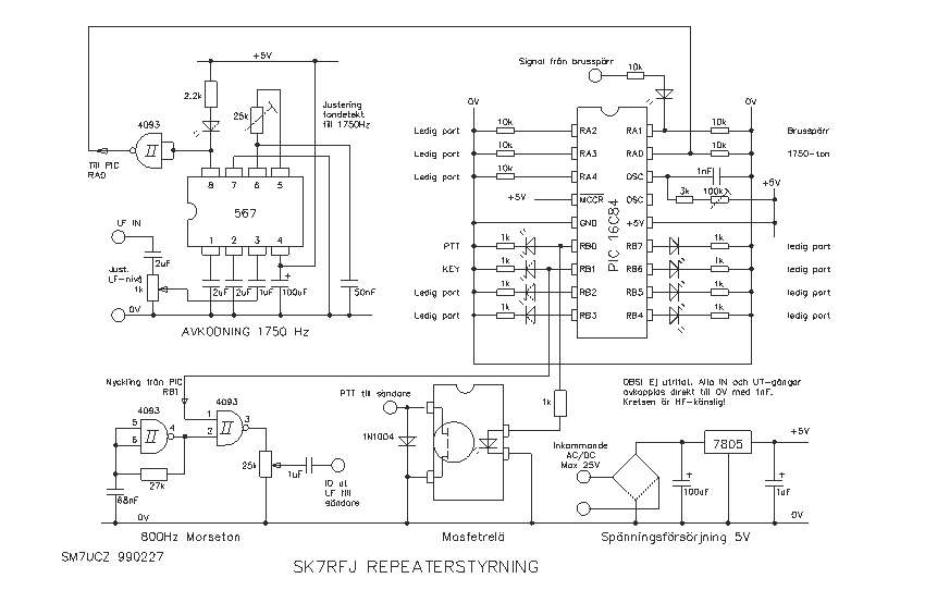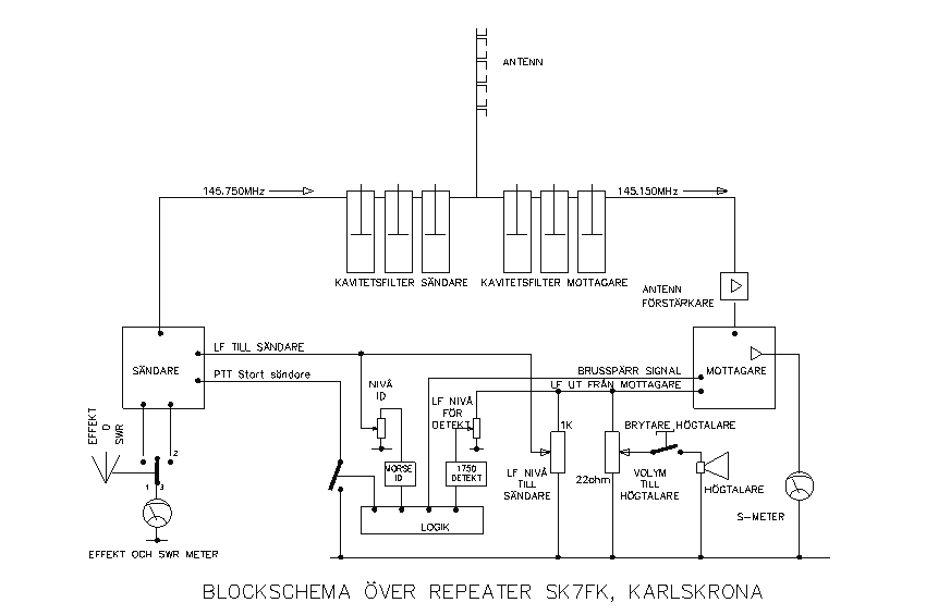 Repeatern har varit i drift i över 30 år, men inte så som den ser ut idag. Kaviteterna och sändaroscillatorn (HW202) är kvar sedan original. Kaviteterna har framlidne Alf Ädel tillverkat i sitt kök, ett gediget hantverk. 1996-97 så hade repeatern hängt sig i sändningsläge, allt för ofta, så då började jag att intressera mig för den. Sändare och mottagare var Heathkit HW202. State of the art då den byggdes. Logiken var diskreta komponeter och IC-kretsar. Jag skrotade på eget bevåg allt utom kaviteterna och sändaren HW202, för den var kristallstyrd och ok som styroscillator. Vad är det som behövs för att en repeater skall arbeta? Mottagare, sändare, kaviteter och någon logik för att starta sändaren när behov föreligger. Från mottagaren behövs en signal när bruspärren öppnar, alltså när den hör någon station. I princip kan man använda denna signal för att starta sändaren. Då har man en bruspärrstyrd repeater. Vid varje störning in på mottagaren så startar sändaren och återger störningen, kanske inte så muntert. Dessutom så säger föreskrifterna att repeatern skall identifiera sig vid start och var 15 minut. Standard inom repeatervärden är (var) att man öppnar en repeater med att sända en ton på 1750Hz. Eftersom jag börjat använda microcontroller i mitt arbete så fann jag att en sån skulle platsa för detta arbete också. En smart kille hade kunnat hantera en controller så att den kunde detektera 1750 ton samt generera morseton programmässigt. Nu tillhör jag inte dessa, så jag tog en genväg och byggde dessa funktioner med yttre komponenter. Att detektera 1750 ton finns färdiga kretsar anpassade för. Kretsen 567 innehåller allt som med hjälp av några yttre frekvensbestämmande komponeter lystrar till 1750Hz. Morsetonen tillverkades av en grind, den"sjunger" alltid men nycklas av controllern via en annan grind. Controllern behöver fyra signaler för sitt arbete, upptäcka 1750-ton, detektera bruspärren, starta sändaren och nyckla morsetonen. Controllern PIC 16F84 har 13 pinnar som kan användas som in eller utgångar. Det blir alltså 9 pinnar "över". Där satte jag lysdioder som hjälpte mej vid programutvecklingen, och som idag visar lite olika status under trafik. Mottagaren är en före detta kommunikationsradio från Lunds busstrafik. Peter, -LNJ fixade fram dessa. Vi bytte kristall och trimmade om syntesen. Apparaten har färdig signal från bruspärren och en utgång för S-meter. Den är lite upphottad med en yttre antennförstärkare. Sändarens slutsteg är en före detta Minicall sändare på ca 170MHz som är omtrimmad. Även denna är fixad av Peter. Den gamla HW202 oscillatorn fungerar som styrsändare. En inbyggd SWR-effektmeter är kopplad till yttre instrument. Uteffekten är strypt från ca 70W till 30 - 40W för att slutsteget inte skall bli för varmt vid långa trafikpass Nätaggregatet är ett "bautaaggregat" från gamla Comvics 450 telefonsystem, 14V 30A med drosselreglering. Och ett nytt skåp har en firma ovetandes sponsrat oss med! Så funktionen är följande idag: Vid inkommande 1750 ton detekteras detta av kretsen 567 vilken rycker i ben RA1 på controllern. Programmet väntar tills bruspärrsignalen försvinner (och 1750 tonen). Startar sändaren. Och skickar ID via morse, SK7FK. Om det inte kommer någon trafik inom 5 - 10 sek så stoppas sändaren direkt. Kommer det trafik, så måste första trafikpasset vara minst 3-5 sekunder, annars anser controller att det är "flutteröppning" och stoppar sändaren. Kommer det ett normalt anrop så tillkännages detta med ett längre "rogerpip"ett "K" , därefter är det ett kort "rogerpip", ett "e" mellan passen. Efter ca 15 minuter skickas ett ID igen osv. Men efter drygt 30 minuter så drar processorn i nödbromsen och stänger sändaren. Detta är en säkerhetsåtgärd för att förhindra att sändaren hålls uppe av störningar. Controllern kan inte avgöra om det är flutter som öppnar bruspärren eller normal trafik. Vissa är lite irriterade över detta, men så är programmet. Och den har aldrig hängt sig i okynnes sändningsläge sedan detta infördes. Det är att starta upp logiken igen med 1750 ton. Sista passet har dock delvis gått förlorat. Om repeatern öppnas 3 gånger utan att det startas trafik, dör den i 15 minuter. Detta behövs mot gummitummar och kraftiga konditioner! Efter ett normalt trafikpass så avslutar repeatern med att sända "KARLSKRONA" som avslutnings ID. Repeaterantennerna sitter på "LRP-blocket", lasarettet i Karlskrona, fri sikt runt om, ungefär 40 - 50 meter över havet. Idag har vi sämre antenn, Den gamla fick vi riva när ny kraftkanal skulle fram till nya kylkompressorer för ventilationen. Vi fick vara kvar på nåder, vissa läkare vill ha bort alla "obehöriga" antenner på taket. (Taxi, Närradio). Gamla ambulansmasten 10 meter hög, av glasfiber var ledig, så den fick vi. Den bär inte en kommersiell fyrstackad dipol, så vi kör för närvarande med två Vårgårda dipoler. Separerade antenner för sändare och mottagare. Till våren Repeatern kraftförsörjes av primärkraft, alltså vid kraftbortfall får vi kraft från lasarettets dieslar. Detta fick vi vid milleniumskiftet.