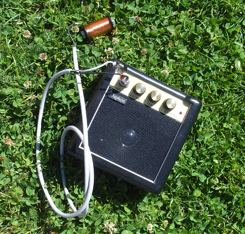 En spole, LM386 förstärkare på högsta volym och en högtalare |