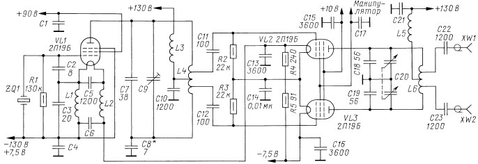 There are several circuits on the web that I studied. I had problems with the choke L2. The affected output significantly. Approximately 600mW output power at 100V and 25mA input. Direct heated tubes with 1.2 V. The first tube takes only 13mA, while the other want 255mA of filament current. Original drawings to the transmitter I have not found.
