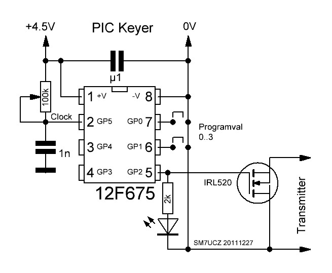 BeaconA simple circuit to allow the transmitter to run Beacon for a while. Morse speed is set with 100k trimmer. Here is the simple PIC-program... beacom.asm Read with a texteditor.