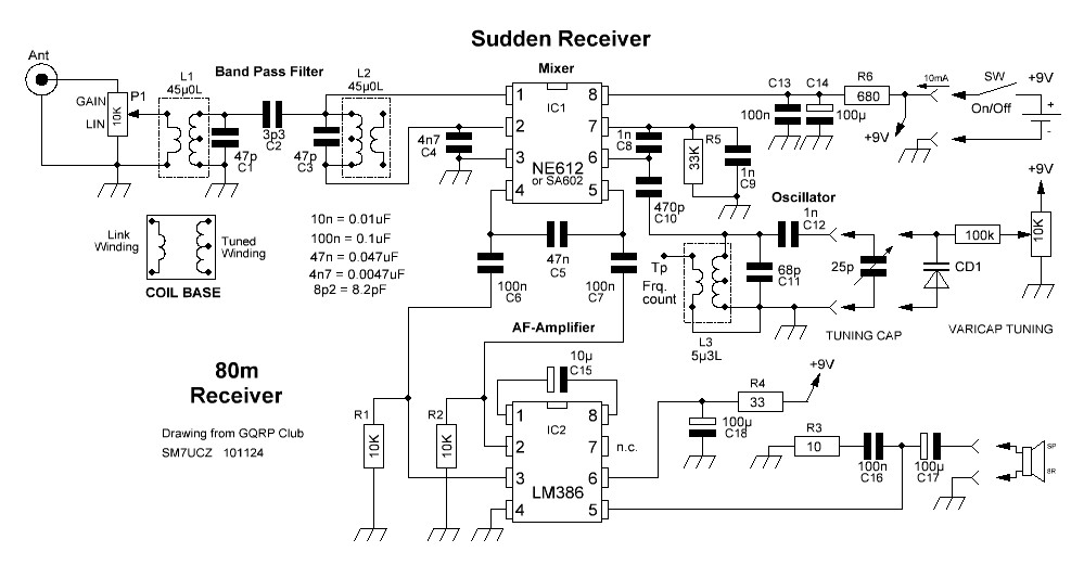 Modifierat schema från GQRP's Sudden receiver. Önskade en monitormottagare på labbänken som ersättning för rävsaxen när jag testar sändare oscillatorer osv.