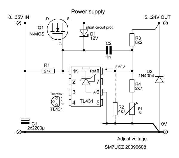 TL431 är en reglerbar zenerdiod med kraftig inre förstärkare som drivs av den shuntsröm som går igenom. Minsta ström får vara 1mA och högsta 100mA. Och max spänning över kretsen 36V. Med lite knep går det att använda kretsen i andra aplikationer. Dessutom är kretsen väldigt billig...2:50 SEK med moms!
