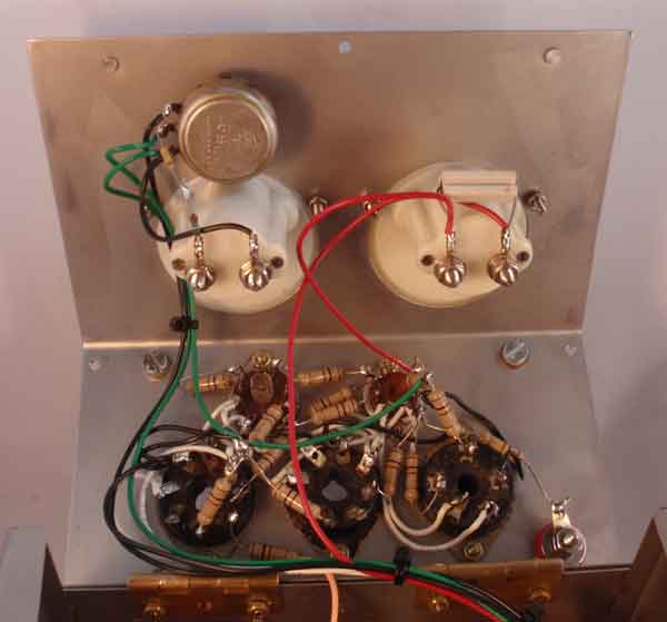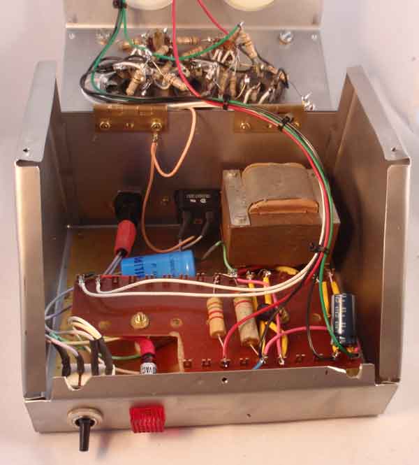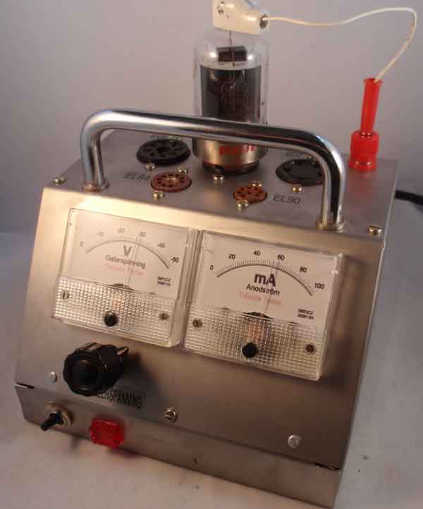 Förenklat schema. Anodspänningen är jordad till chassit för att toppkontakten inte skall ha någon farlig spänning. Katoden kommer då att ligga på -300V. Men den ligger skyddad inne i apparatlådan.
