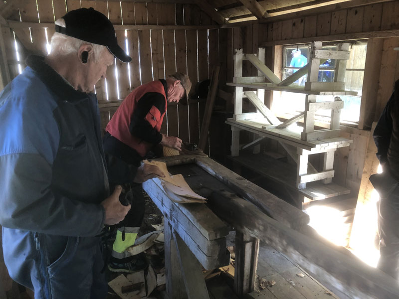 Första stoppet hos Björkeryds Bruk. Anders hyvlar takspån.
