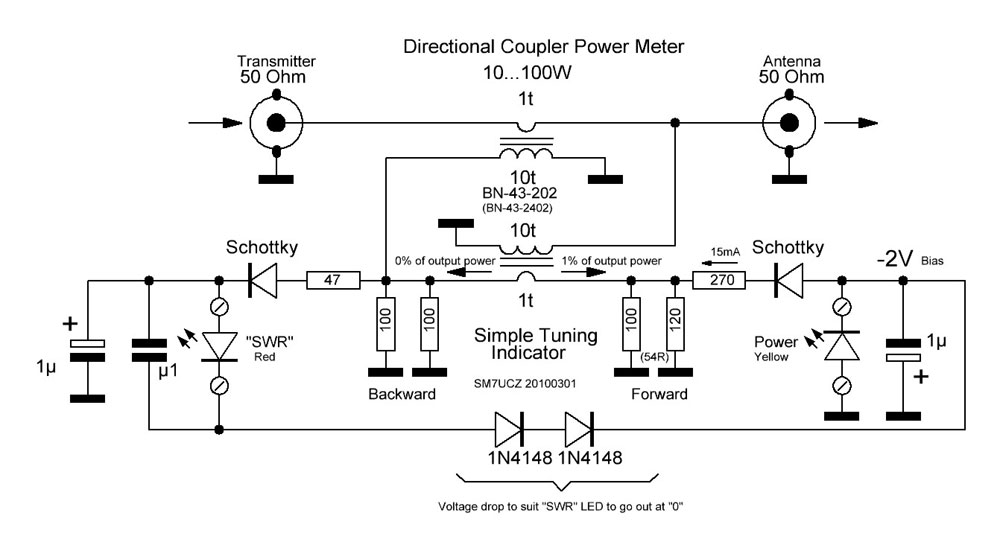 Efter en del labbande och grubblande så kom jag fram till denna lösningen. Om de båda lysdioderna vändes 180 grader mot varandra så kan man använda den enas (Power) framspänningsfall som förspänning till den andra (SWR). Powerdioden lyser alltid vid inkommande effekt. SWR-dioden däremot skall trimmas vid avstämning till att slockna. Denna koppling funger bra mellan 10...100W sändareffekt. Nu använde jag dessutom högintensiva lysdioder. Med de två 1N4148 dioderna så skapas ett spänningsfall från förspänningen så att SWR-dioden precis börja glöda, när tuningen är ok. Trimningen sker enbart mot SWR-dioden. Powerdioden ändrar inte mycket i styrka, förändringen är svår att uppskatta för ögat. Men är det avbrott till antennen lyser inte Powerdioden. Lite nytta gör den i alla fall.