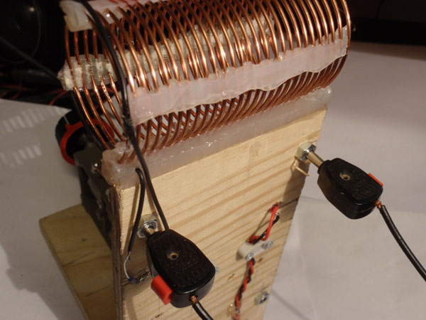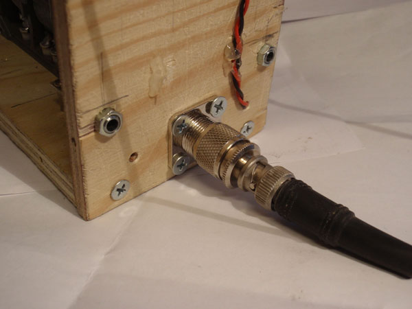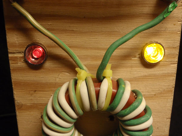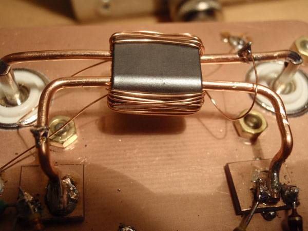 Riktkopplaren med ferritkärnan BN43-202. De grova ledningarna är ett varv i kärnan.