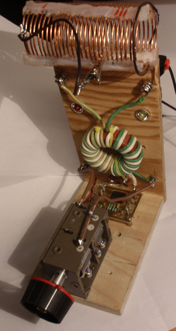 Efter lite labbande kom jag fram till det uråldriga knepet att ha en lampa i spolen för avstämning. Men här har jag ersatt lampan med en lysdiod. Nu börjar det att fungera. "SWR" dioden börjar att dimma ner vid 1:2 och helt släckt vid 1:1. Powerdioden lyser inte vid oavstämning, men kommer mer och mer ju bättre steget är avstämt.