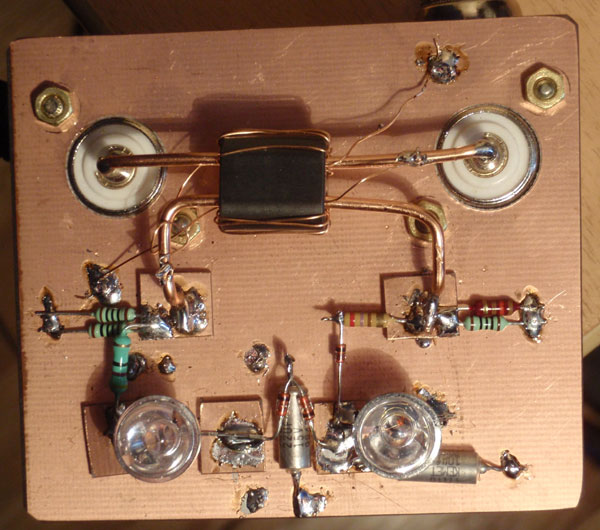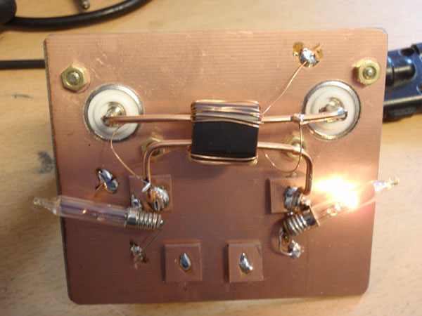Det första jag tänkte på var att använda en riktkopplare och små glödlampor. Eftersom sändarna har 50 ohms utgångsimpedans. Riktkopplaren lindades på en tvåhålskärna. Detta fungerar... men allt eftersom lamporna ändrar i ljusstyrka så ändrar sig resistansen och därmed riktkopplarens 50 ohms balans. Iden var god... men för snabb...