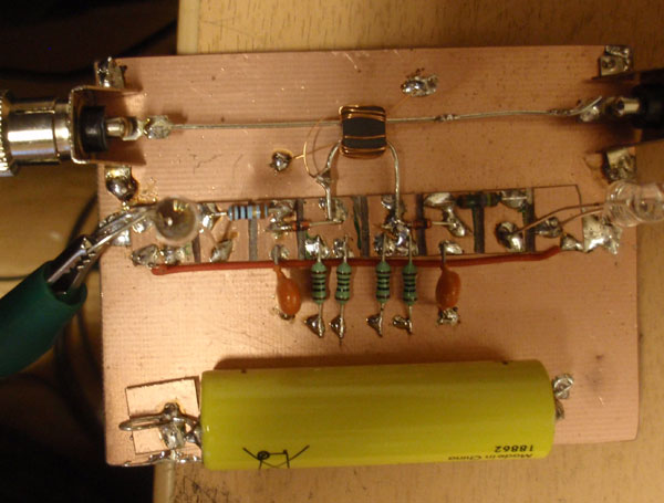 Nu började jag att laborera med lysdioder och fasta termineringsmotstånd för att hålla riktkopplarens i 50 ohms balans. Eftersom lysdioder behöver ca 2V för att tända, så blev det liksom ett "glapp" i SWR-dioden när avstämningen skall trimmas mot NOLL. Lysdioden slocknar långt innan avstämningen är OK. Det går att vrida fram och tillbaka på avstämningen och uppskatta mittläget, där troligen reflekterande effekten är NOLL. Lysdioden behöver förspännas med 1.7V för att minska på "glappet". Ett 1.5V batteri fick ordna med förspänningen. Nu började det att fungera efter önskemålet. Men varför använda batteri till förspänningen? Kunde inte kretsen fixa förspänningen själv?.