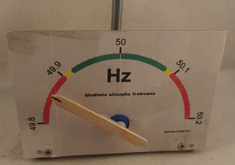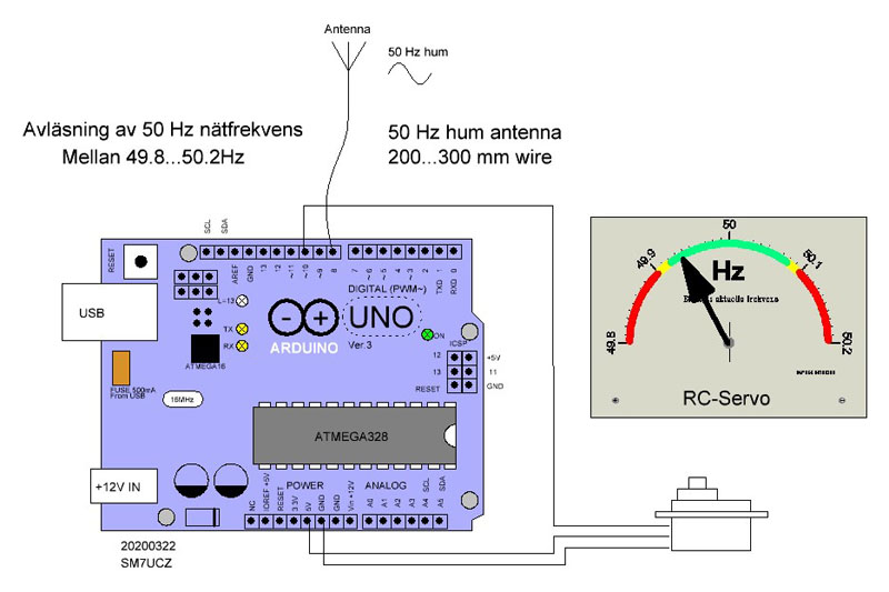 Vi behöver inte ansluta oss till elnätet, utan vi sniffar upp lite av det 50Hz brum som omger oss i luften. El-allergikerna har kanske rätt?? Så vi behöver inte riskera att kladda på några farliga elledningar! Arduinon drives med en vanlig telefonladdare med 5V. Ett enkelt projekt att börja leka med Arduino! Helt ofarligt. En trådstump i port 8 räcker för att sniffa upp frekvensen i luften. Programmet mäter hur lång tid det tar att räkna in 50 pulser, och kalkylerar sedan frekvensen med tre decimaler. Antingen tar man ett visarinstrument, eller ett RC-servo som display. De häringa små Microservona tar så lite ström att de går att driva dem direkt från Arduinokorten. Som visare har jag använt en glasspinne! Servot är ingen precisionspryl. Programmet anbefaller servot att gå till en vinkel mellan 0° till 180°. 0° - 90° - 180° stämmer inte exakt. Man får inte allt för 9:- kronor från Kina. Jag har limmat visaren så att 90° blir "rätt". Det blir en indikering var frekvensen ungefär ligger, inte med tre decimaler precis. Den som är mer nyfiken får koppla en display till Arduinon och få frekvensen med tre decimaler. Visaren rör sig nästan som en vindrutetorkare! Svenska Kraftnät har nog ett litet helsike att hålla frekvensen, nu när alla vindkraftverken puttar ut kraft efter hur vindpustarna kommer. Den enda större reglerverkan har de via vattenkraften! Nu kan du följa nätets frekvens, på mornarna brukar nätet vara belastat och frekvensen sjunker. Börjar frekvensen närma sig 49,8Hz så är det dax att leta fram ficklampan innan strömmen går på grund av överbelastning! Programmet hittar du här. Spara ner och öppna i Arduinoprogrammet. Doctor Weber har gjort grundprogrammet, jag har anpassat det till servovisningen.