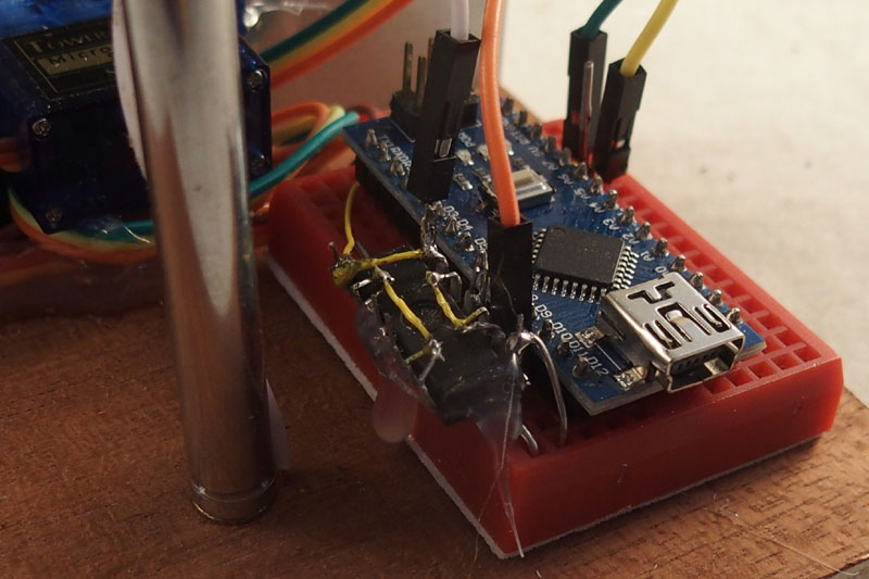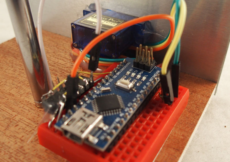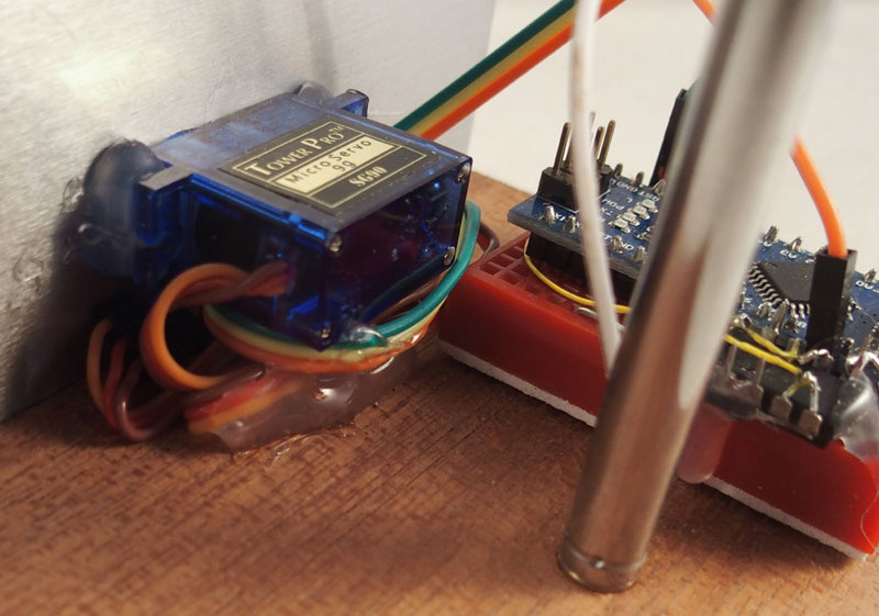 Ett 12,5 mm hål i frontpanelen samt lite smältlim håller det lilla servot på plats. Visaren är oxo smältlimmad på en av tillbehörsarmarna.