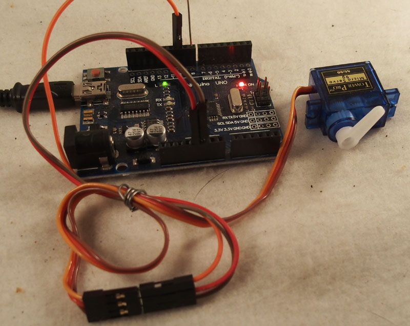 I startkiten till Arduino följer ofta med det lilla servot SG90. Och tre skarvtrådar behövs mellan servot och Arduinon. Testkoppling
