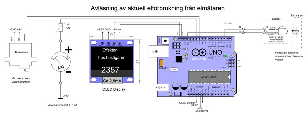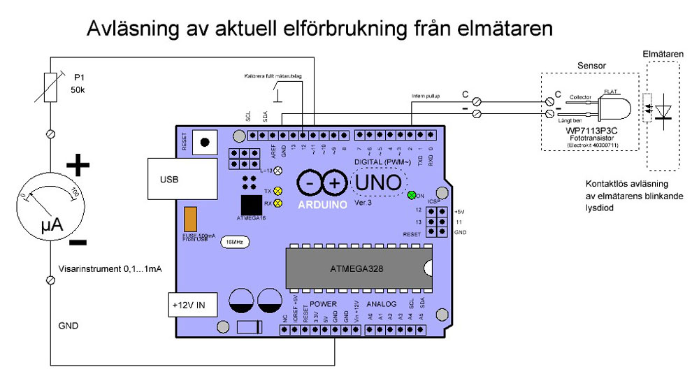 Det behövs inte så mycket runtomkring en Arduino för att avläsa elmätaren. Det mesta ligger i programmet som du kan hitta här.