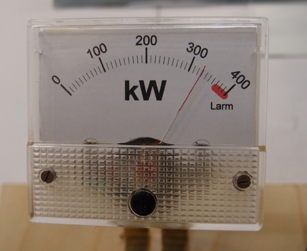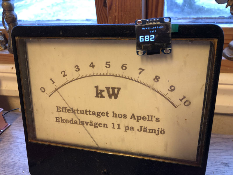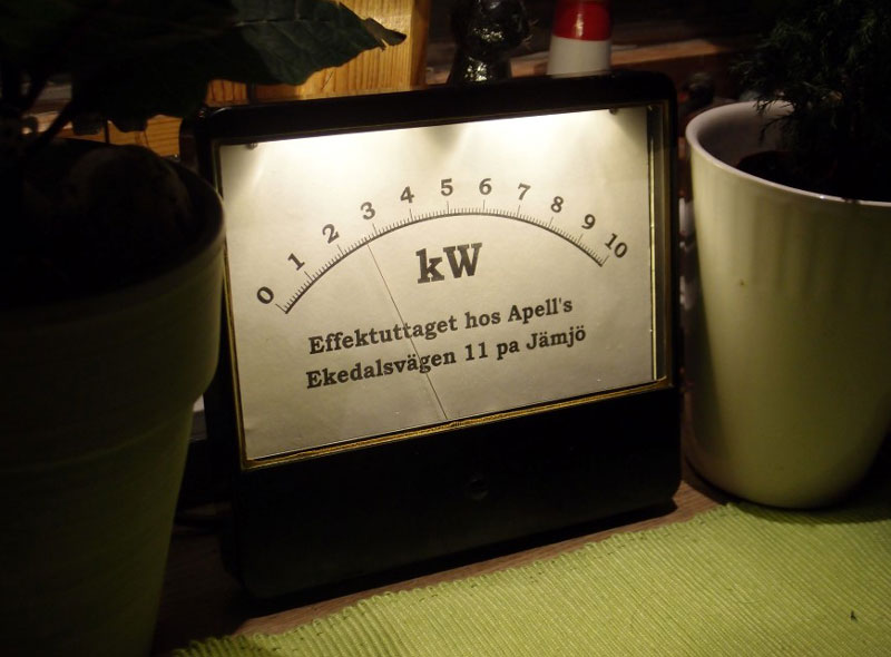 Då har effektmätaren hos Apell's blivit digitaliserad med analogt instrument! Står i köksfönstret, och frun har järnkoll på visaren! Det är -2,3C utanför och värmepumpen ser inte ut att vara fullt utnyttjad. Är det inte vackert med ett visarinstrument... mot fladdrande siffror i en display? Men visst, digitala siffror är noggrannare. Ett vridspoleinstrument är en mekanisk konstruktion som har några % felvisning. Och gamla surplusinstrument som har skramlat runt i lådor kan ha tvivekaktig noggrannhet. Electrokit kommer att ta fram ett "kit" till den här konstruktionen.