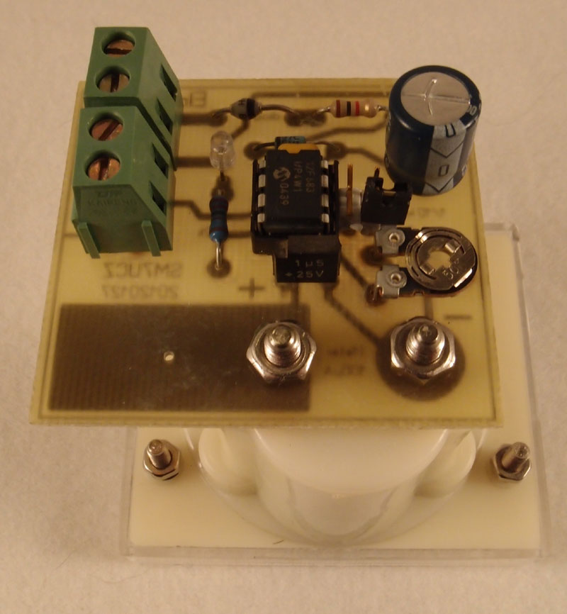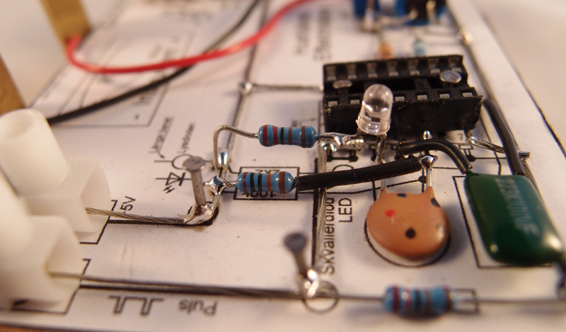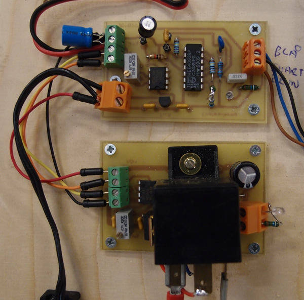 De fick nys om mitt projekt, så jag snabbfixade några kort. Problemet här var att maxfrekvensen på den blinkande lysdioden är 7.22Hz. Som Karlskronabo sa jag att det gaur inte. Historien är den att i västra blekinge så säger man till, så blir arbetet utfört...därför att det är 'tesagt'. Men i östra Blekinge så gnälls det och man svarar att det gaur inte...fast det är 'tesagt'. Jag började att labba lite med komponenterna för denna låga frekvens, och det blev bättre och stabilare än jag trodde.. Nu var det läge att prova larmkretsen för överström. Med hystereskoppling så klarades även den låga gungande frekvensen. Ett bilrelä skruvades fast. Ringklockan under arbetar med 24V=, 200mA.