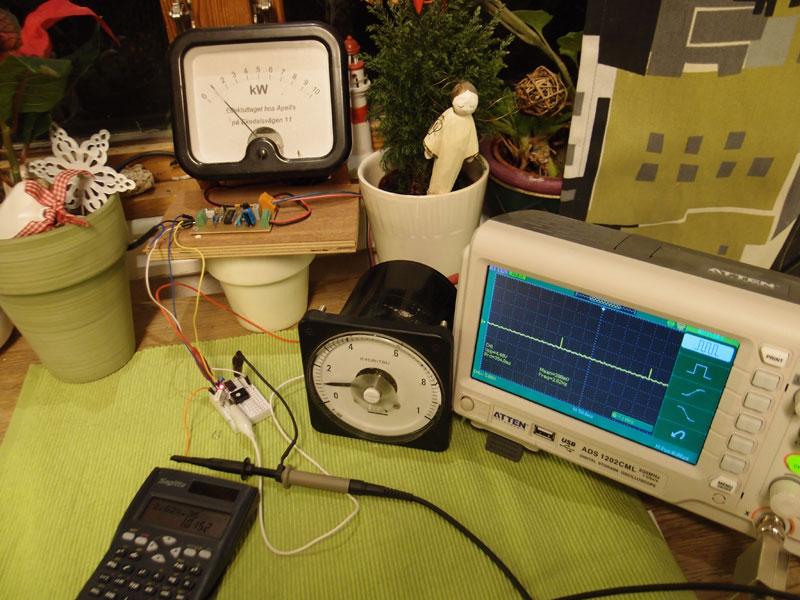 Här har jag kopplat upp PIC-processorn parallellt med den analoga och kontrollmäter med oscilloskopet bland julpyntet.. Pulsfrekvensen × 0.36 ger effekten direkt. 2,87Hz × 0,36 ger 1,03kW.. Det ser ut att stämma.