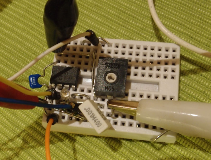 Uppkopplingen för test. En stump (30cm) i port 8 som antenn. Arduinokortet är en kineskopia. Servoarmen visar nu frekvensen, rakt upp är lika med 50,0 Hz.