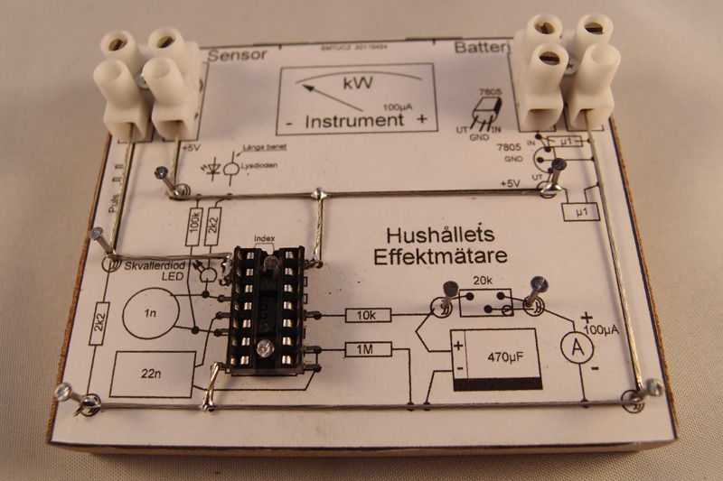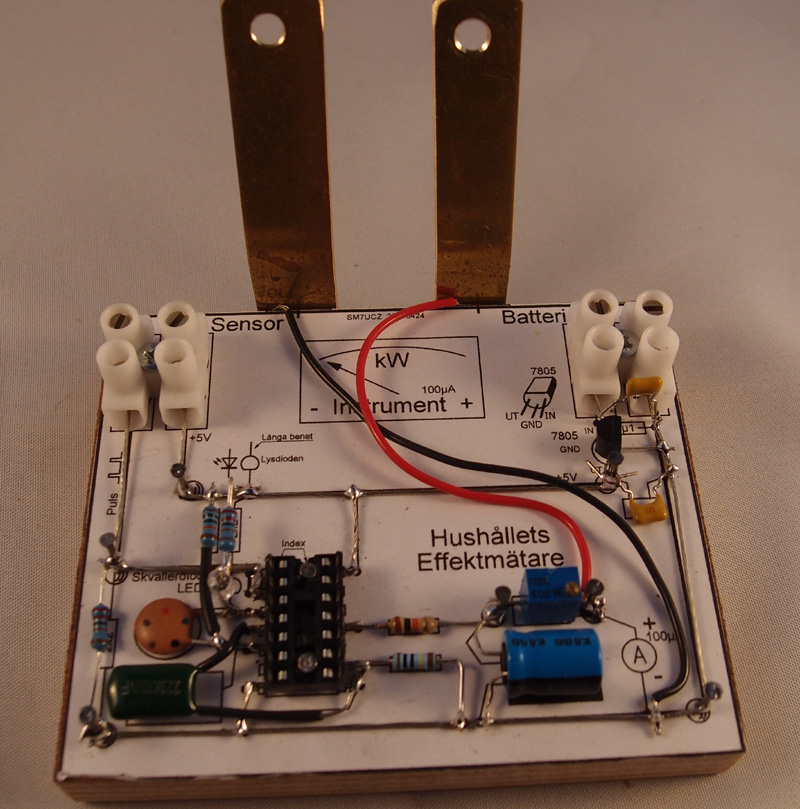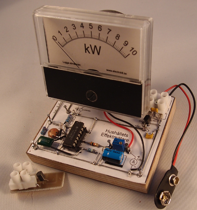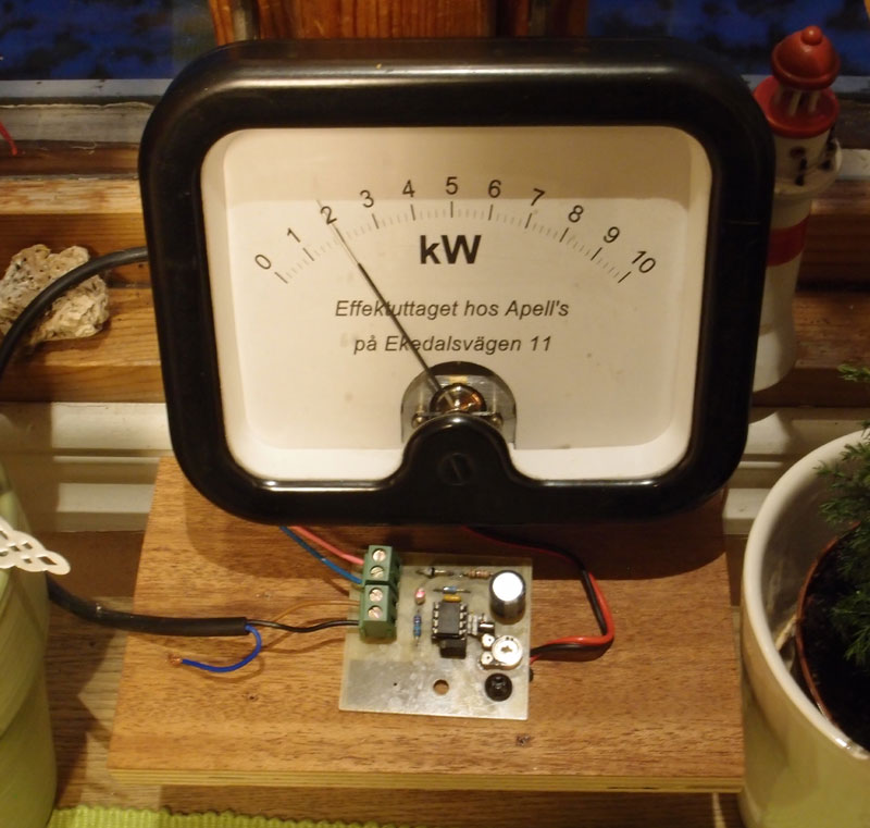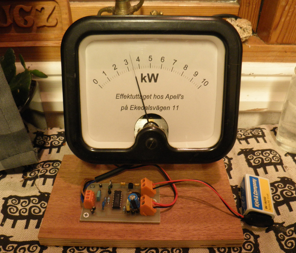 Med hjälp av några få komponenter så är det enkelt att ha koll på hushållets aktuella effektförbrukning. Inga µ-processorer behövs, bara en enkel logikgrind 4093. Vi har en värmepump som tar ca 3kW. Och innan har man aldrig märkt att varmvattenberedaren "tar ström". Men det märks direkt efter man spolat i kranen! Energin rinner helt synbart ut i avloppet. Ca 4,5mA tar kortet. 100µA instrumentet har här graderats med ny skala utskrivet på papper och limmats ovanpå den gamla skalan.