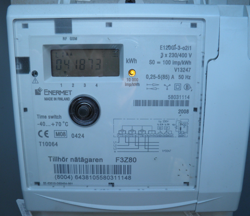 Detta är vår elmätare på Ekedalsvägen 11 i Jämjö. Den gula lysdioden blinkar 10.000 gånger per förbrukad kilowatttimme kWh.
