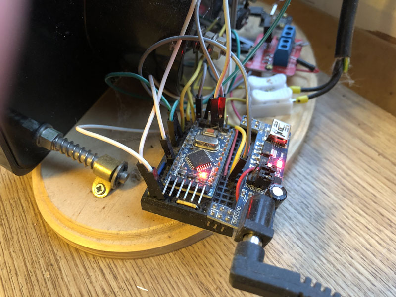 Här har jag använt ett microkort, men det har samma funktioner som det stora UNO-kortet. Till höger sitter powerkortet som matas med 12V. Längst bort på plattan sitter korten för styrning av belysningen i instrumentet. Ett fotomotstånd och en transistor för drivning av vita lysdioder i instrumentet.