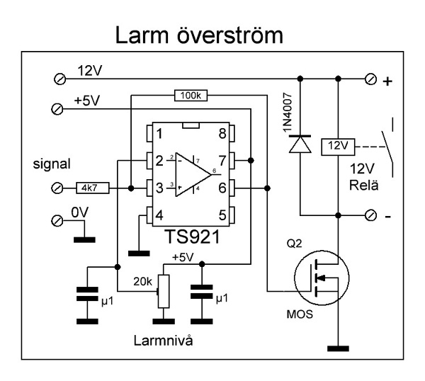 Larmnivån justeras med trimpotentiometern. Lite hysteres har lagts in för att få ett distinkt omslag.