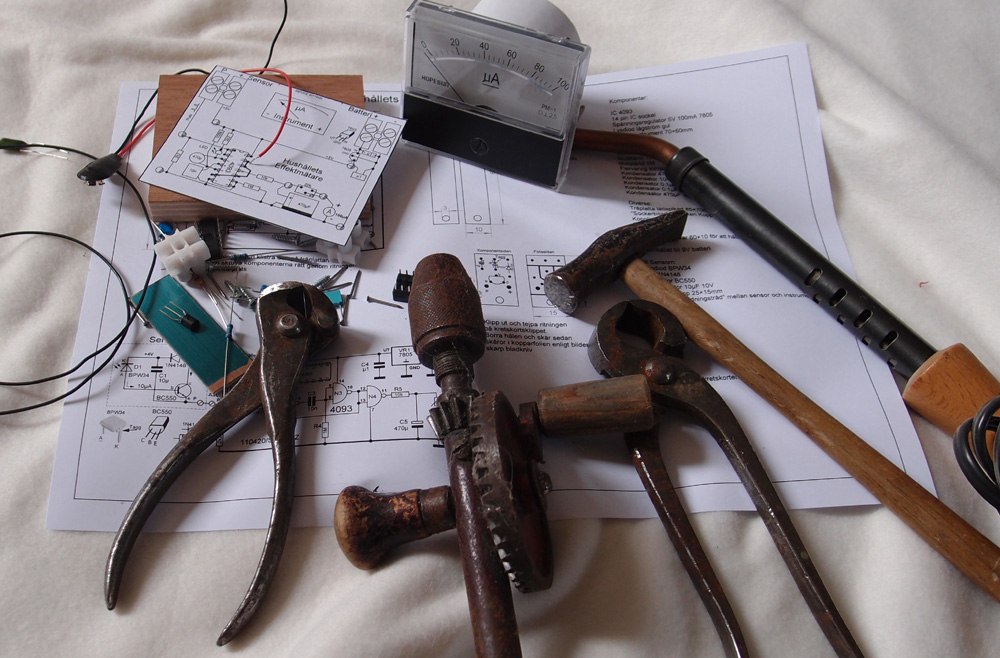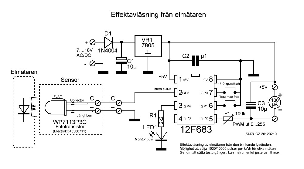 Det gamla klassiska sättet är att montera strömtransformatorer.. men det kräver elbehörighet och pengar. På våra nya elmätarna finns en LED, lysdiod som blinkar i takt med elförbrukningen. Det står hur många impulser det kommer per kWh. På min mätare kommer det 10.000 imp/kWh. Vi har 16A huvudsäkring och 400V nätspänning. Det ger att vi kan max ta ut ca 11kW innan säkringarna sticker. (16×400×1.732=11085) Vid 10kW uttag kommer mätaren att blinka 10 ×10.000 = 100.000 impulser/timma. Delar vi detta med en timma (3600sek) så får vi att pulsfrekvenser blir ca 28Hz vid 10kW effektuttag. Frekvensen blir direkt proportionell mot effektuttaget. Hmmm... om vi nu placerar en ljuskänslig komponent framför den blinkande lysdioden, så kan vi avläsa effektuttaget. Utan att göra ingrepp på mätaren eller elinstallationen. Vi kan bygga ett litet instrument för att ha koll på effektförbrukningen. Nu blir inte detta ett precisionsinstrument. Men man får en ganska noggrann fingervisning om vilken effektförbrukning man för tillfället har. Genom att trycka på knappen under displayen på elmätaren, går det oftast att hitta menyn för direkt visning av kW, utmärkt för att kalibrera sitt hemmagjorda instrument med. Detta är ingen ny idé. Och inte min. Den kom direkt efter man börjat montera de nya elektroniska mätarna. Efter en del googlande så fann jag att alla använder datorer för att visa mer eller bättre grafer med statistik på förbrukad energi under dygnets olika timmar. Statistiken kommer ändå på elräkningen! Men jag ville läsa direkt på ett visarinstrument vad som förbrukas NU! Och varför låsa en dator dygnet runt för detta... hur mycket ström behöver den? Och det går att köpa en sensor hos en känd hobbyfirma...men 800:- SEK låter lite som ocker... visserligen är datorprogrammet 'gratis'. Och jag är förtjust i gamla fina visarinstrument som jag köper på loppisar. Här är ett perfekt objekt att använda dessa till. Det har uppkommit lite diskussioner..." får man göra så här?" Ja varför får man inte titta på sin elmätare? Är den så lättmanipulerad? Kan man psyka den? Frågade en elleverantör, och de menade att det är helt OK, så länge man inte rör mätaren.