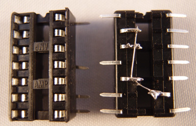 Förbind benen 6-10-12-13 på undersidan av IC-sockeln, böj dem inåt, det blir enklare. Använd en tunn tråd från kopplingstråden.. Böj de andra benen lite svagt uppåt, så blir det lättare att löda dem.