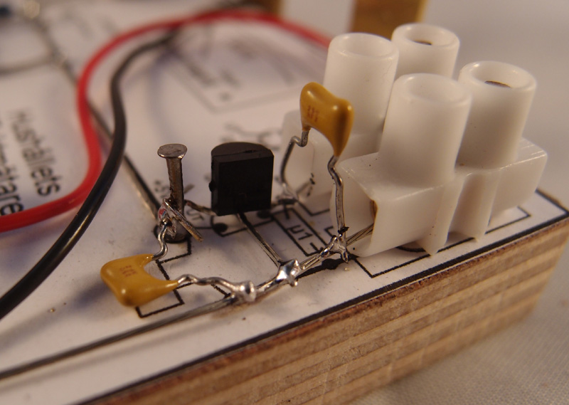 Spänningsstabben 7805, 5V, ena benet direkt till kopplingsplinten.